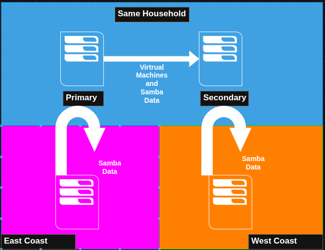 If Primary has a hardware failure I can bring up my VM’s on the Secondary and start the samba service to serve my data. The VM’s will continue to operate using their same IP’s so no interruption there and minimal services such as scanning will require a manual IP change since the samba share is on a new IP (of the secondary host). I reconfigure sanoid on the Secondary to the snapshot schedule that was on Primary
